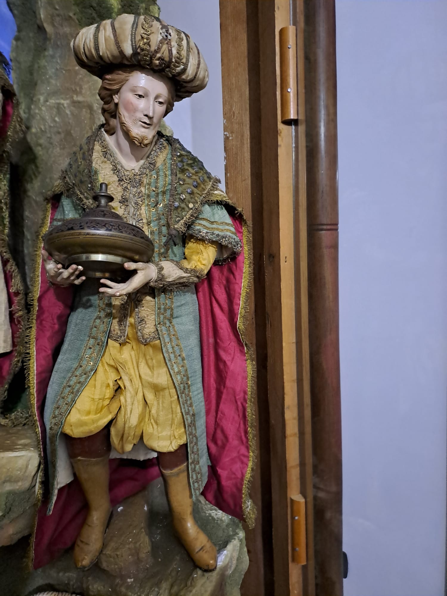 Re mago giovane (Gaspare) – Busto in terracotta modellato a mano e dipinto ad olio – Occhi di vetro – Arti in legno – Abito in seta e velluto – Corpo in fil di ferro e stoppa