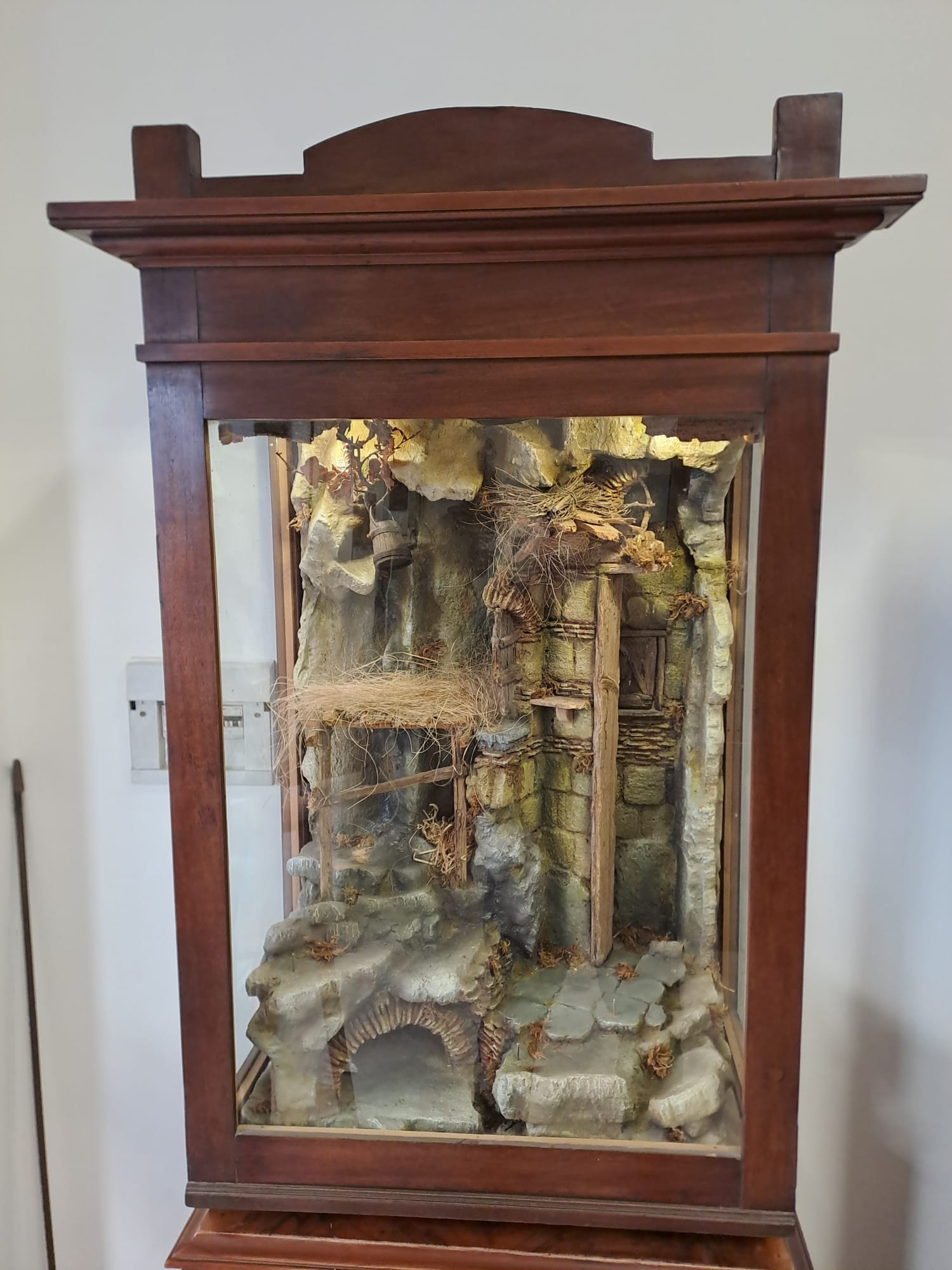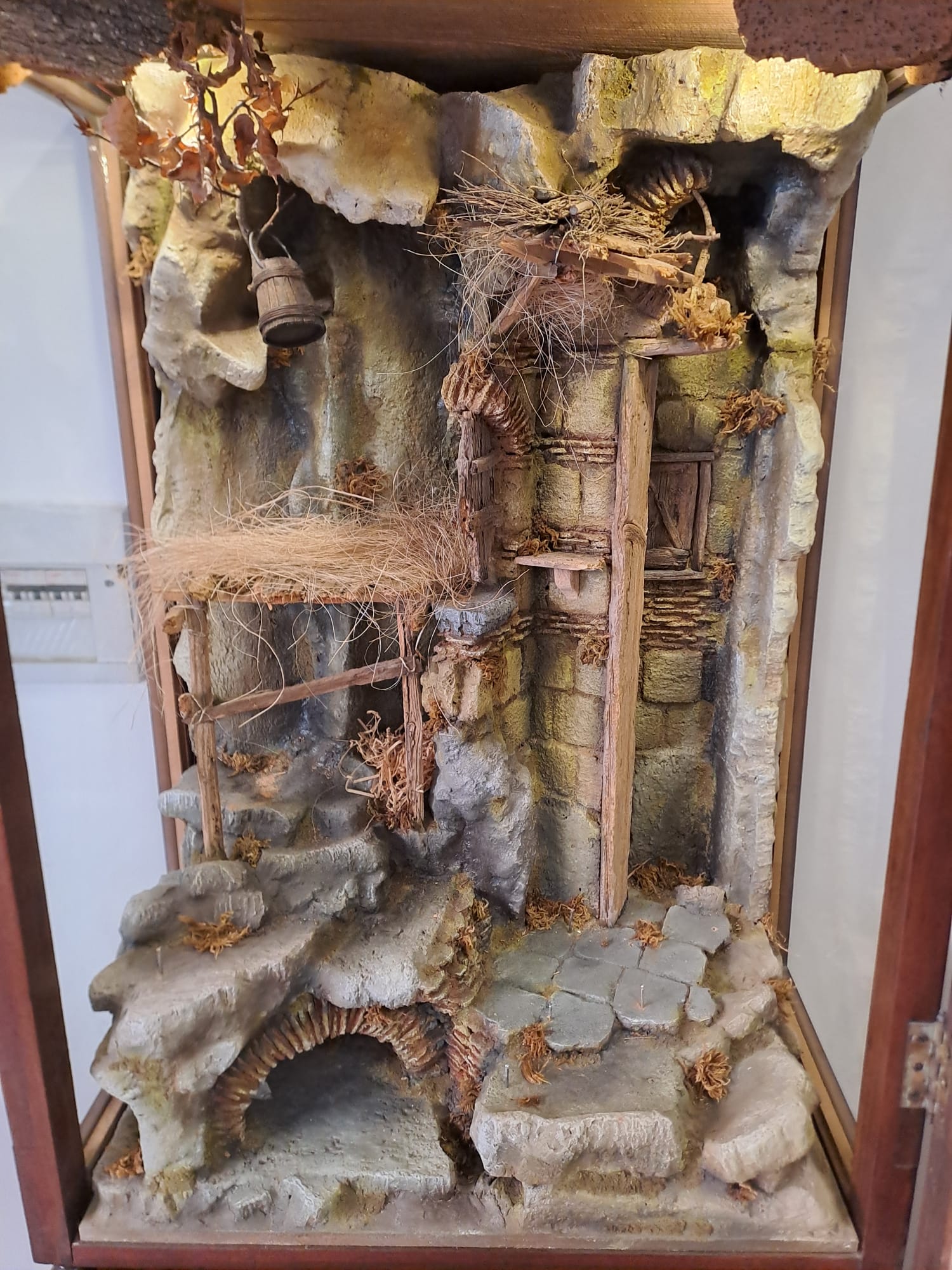 Scena di natività e annuncio ai pastori in legno e sughero in antica scarabattola napoletana per pastori da 40 cm